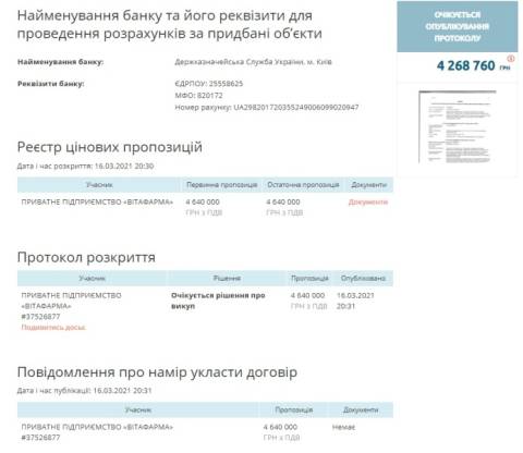 Аукціон стартував сьогодні, 17 березня, участь у ньому взяла лише одна фірма – ПП "Вітафарма", яке й визначили переможцем. Зазначимо, початкова вартість приміщення становила 4 268 760 грн, а продали його за 4 640 000 грн.