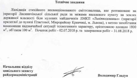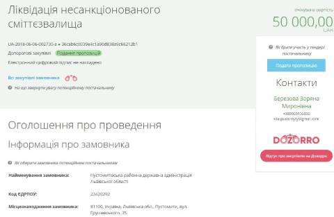 Пустомитівська РДА оголосила закупівлю на ліквідацію несанкціонованого сміттєзвалища, яке знаходиться нза межами села Лисиничі біля мулових майданчиків ЛМКП "Львівводоканал", що поблизу вул. Пластової у Львові.