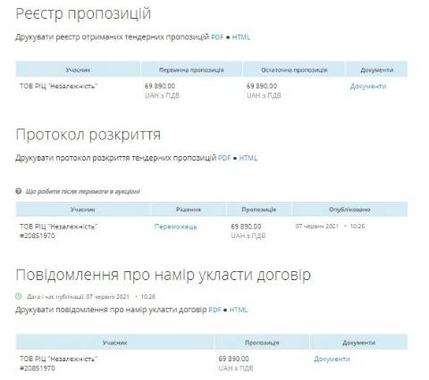Аукціон стартував 4 червня, на нього подався лише один учасник – ТОВ РІЦ "Незалежність", що оцінив свої послуги 69 890 грн. Його й оголосили переможцем торгів. Зазначимо, очікувана вартість закупівлі становила 199 600 грн.