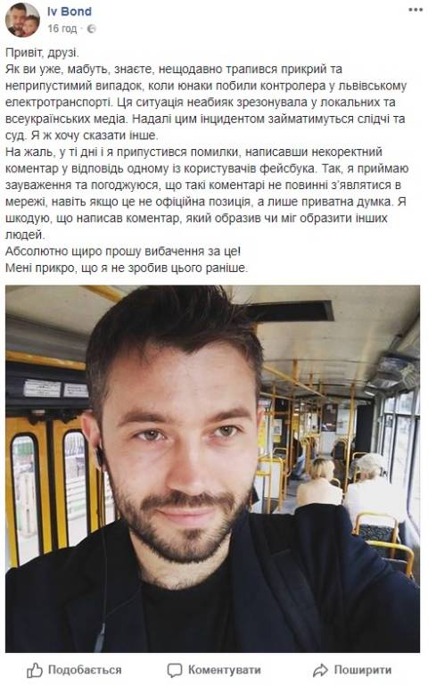 "Як ви уже, мабуть, знаєте, нещодавно трапився прикрий та неприпустимий випадок, коли юнаки побили контролера у львівському електротранспорті. Ця ситуація неабияк зрезонувала у локальних та всеукраїнських медіа. Надалі цим інцидентом займатимуться слідчі та суд. Я ж хочу сказати інше.