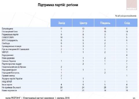Серед усіх опитаних, на заході України 10% виборців проголосували б на виборах за Самопоміч, а на сході, півдні і центрі партію підтримують 5%. Найбільший рейтинг серед мешканців західних областей має ВО "Батьківщина" – 11%, ще 20% опитаних вирішили не брати участь у виборах.