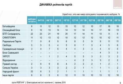 Щодо Блоку Петра Порошенка, то у жовтні 2014 року партію підтримували 22% виборців, однак з січня цього року рейтинг почав стрімко падати, зупинившись на 9% у серпні.