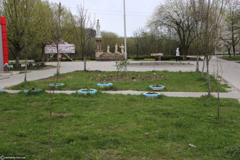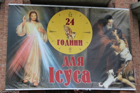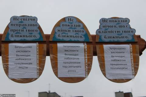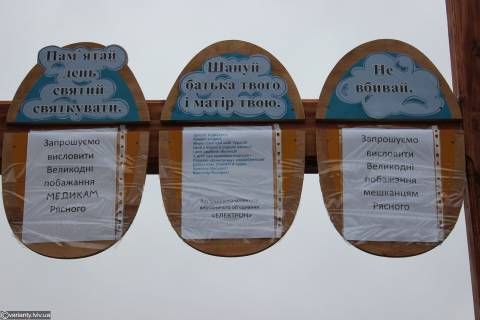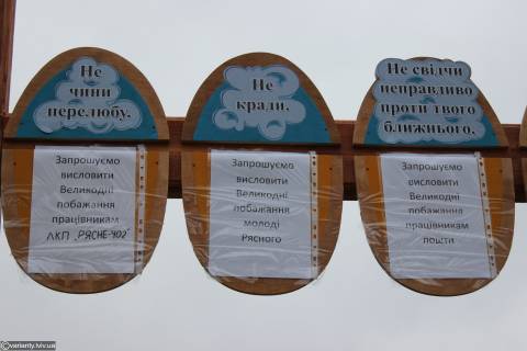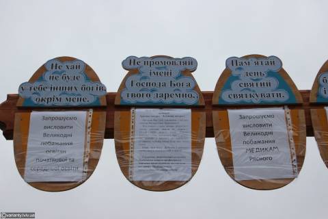 Але не тільки Унійна традиція УГКЦ збурює недолюблену (і тому упосліджену) спільноту Рясного гігантоманськими нахилами ліворуч. Цьогоріч перед Пасхою парафія Василія Великого і Олексія Зарицького УГКЦ встановила ось такий хрест з Божими заповідями на стадіоні школи № 92 (згодом, завдяки втручанню управління культури ЛМР, цей хрест демонтували напередодні Дня міста).