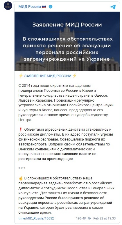 Вчора, 22 лютого, Міністерство закордонних справ Росії повідомило, що розпочинає евакуацію персоналу посольства та консульств в Україні для "захисту життя та безпеки" та нібито через "неодноразові напади".