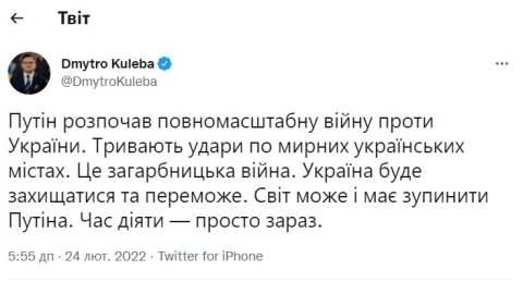 "Путін розпочав повномасштабну війну проти України. Тривають удари по мирних українських містах. Це загарбницька війна. Україна буде захищатися та переможе. Світ може і має зупинити Путіна. Час діяти – просто зараз" – написав Кулеба.