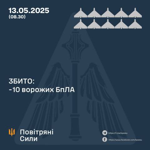 "У ніч на 13 травня (із 23.00 12 травня) противник атакував 10-ма ударними БпЛА типу Shahed і безпілотниками-імітаторами різних типів із Приморсько-Ахтарська – рф. Усі 10 російських безпілотників успішно збито протиповітряною обороною" – йдеться у повідомленні.