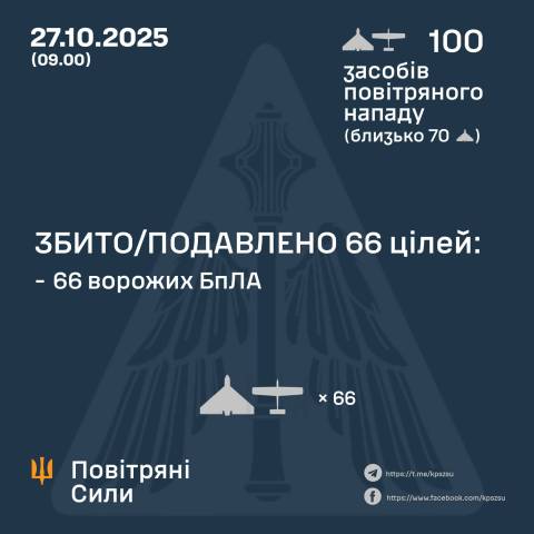 "У ніч на 27 жовтня (з 18:30 26 жовтня) противник атакував 100 ударними БпЛА типу Shahed, Гербера і безпілотниками інших типів із напрямків: Курськ, Орел, Приморсько-Ахтарськ – рф, близько 70 із них – "шахеди".