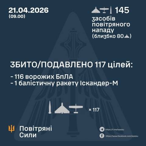 "У ніч на 21 квітня (з 18:00 20 квітня) противник атакував двома балістичними ракетами Іскандер-М із Курської обл. – рф та 143 ударними БпЛА типу Shahed, Гербера, Італмас та безпілотниками інших типів із напрямків:Курськ, Брянськ, Орел, Міллєрово, Приморсько-Ахтарськ – рф, Гвардійське, – ТОТ АР Крим, ТОТ Донецьк близько 80 із них – "шахеди".