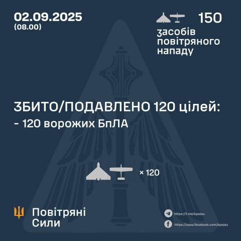 Протиповітряною обороною було знешкоджено 120 безпілотників.