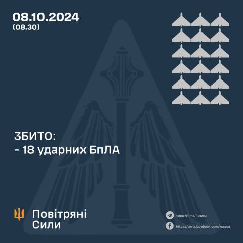В результаті протиповітряного бою усі ворожі безпілотники ліквідовано у Одеській, Миколаївській, Дніпропетровській, Вінницькій та Тернопільській областях: 18 збито авіацією, зенітними ракетними підрозділами, мобільними вогневими групами та РЕБ Сил оборони України, ще один ударний БпЛА повернувся в росію" – йдеться у повідомленні.