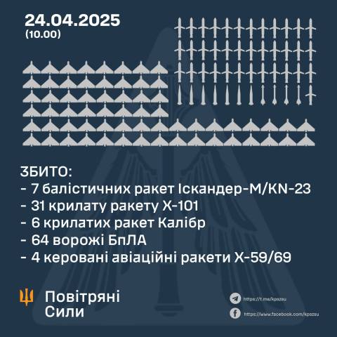 "У ніч на 24 квітня 2025 року (із 19.30 23 квітня) російські окупанти здійснили комбінований удар по Україні ракетами різних типів, а також ударними БпЛА типу Shahed та дронами-імітаторами інших типів. Загалом виявлено та здійснено супровід 215 повітряних цілей противника: