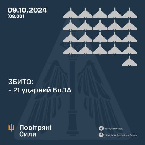 "У ніч на 9 жовтня 2024 року ворог задав удару по Полтавщині трьома балістичними ракетами Іскандер-М/KN-23 із Курської області – рф, а також 22-ма ударними БпЛА із Приморсько-Ахтарська – рф, мис Чауда – Крим. В результаті протиповітряного бою збито 21 ворожий БпЛА в Одеській, Вінницькій та Київській областях. Ще один ударний безпілотник повернув у напрямку росії" – йдеться у повідомленні.