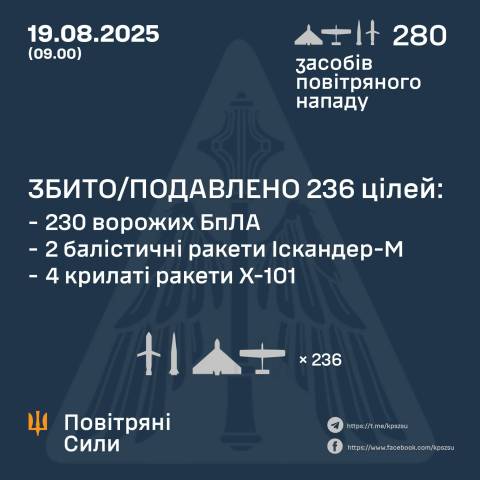 "У ніч на 19 серпня (із 20.00 18 серпня) противник атакував 280-ма засобами повітряного нападу:-