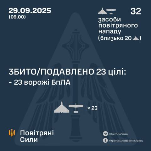 "У ніч на 29 вересня (із 20.00 28 вересня) противник атакував 32-ма ударними БпЛА типу Shahed, Гербера і безпілотниками інших типів із напрямків: Брянськ, Орел, Приморсько-Ахтарськ – рф, близько 20 із них – шахеди.