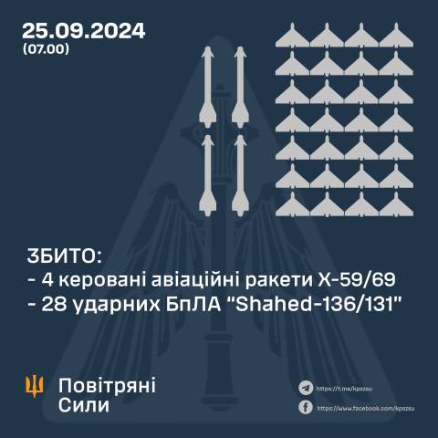 "У ніч на 25 вересня 2024 року російські окупанти атакували Харківщину зенітною керованою ракетою С-300 та трьома ракетами невстановленого типу, Одещину – чотирма керованими авіаційними ракетами Х-59/69 із повітряного простору з акваторії Чорного моря, а також 32-ма ударними БпЛА типу Shahed (райони пусків: Приморсько-Ахтарськ, Курськ – рф).