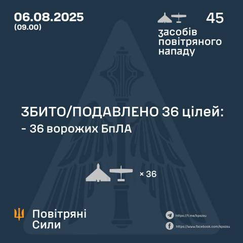 "У ніч на 6 серпня (із 20.30 5 серпня) противник атакував 45-ма ударними БпЛА типу Shahed і безпілотниками-імітаторами різних типів із напрямків: Курськ,Приморсько-Ахтарськ – рф, Чауда – ТОТ Криму.