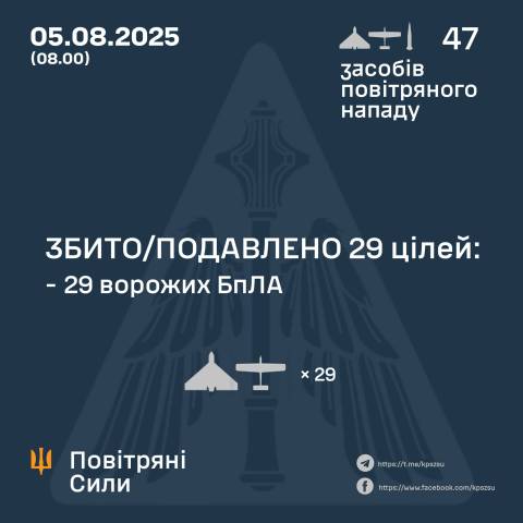 Протиповітряною обороною було знешкоджено 29 безпілотників.