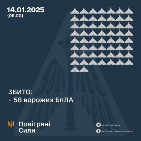 "У ніч на 14 січня 2025 року (із 18.30 13 січня) противник атакував 80-ма ударними БпЛА типу Shahed і безпілотниками-імітаторами різних типів із напрямків Міллерово, Орел, Курськ, Приморсько-Ахтарськ – рф.