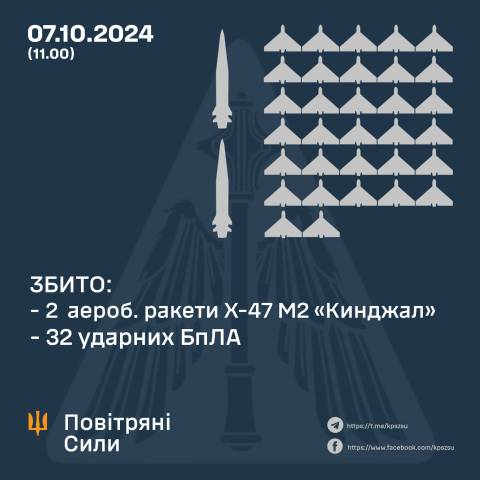 Протиповітряною обороною було збито 32 безпілотники та 2 ракети "Кинджал".