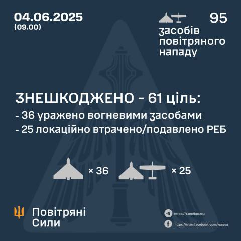 "У ніч на 4 червня (із 22.40 3 червня) противник атакував 95-ма ударними БпЛА типу Shahed і безпілотниками-імітаторами різних типів із напрямків: Курськ, Орел, Міллерово, Приморсько-Ахтарськ – рф, Чауда – ТОТ Криму. Основні напрямки повітряного удару – Харківщина, Сумщина, Дніпропетровщина, Одещина та Донеччина.