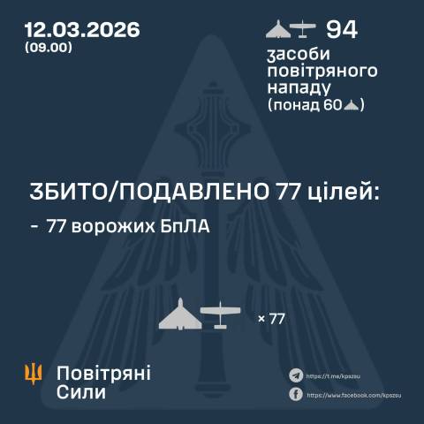 "У ніч на 12 березня (з 18:00 11 березня) противник атакував 94 ударними БпЛА типу Shahed, Гербера, Італмас та безпілотниками інших типів із напрямків: Курськ, Орел, Міллерево Приморсько-Ахтарськ – рф, Гвардійське – ТОТ АР Крим, понад 60 із них – "шахеди".