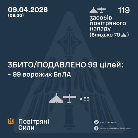 "У ніч на 9 квітня (з 18:00 8 квітня) противник атакував 119 ударними БпЛА типу Shahed, Гербера, Італмас та безпілотниками інших типів із напрямків: Брянськ, Курськ, Орел, Міллерово, Приморсько-Ахтарськ – рф, Гвардійське – ТОТ АР Крим, Донецьк, близько 70 із них – "шахеди".