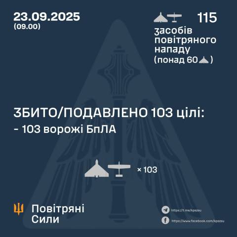 "У ніч на 23 вересня (із 21.00 22 вересня) противник атакував трьома балістичними ракетами Іскандер-М/KN-23 та 115-ма ударними БпЛА типу Shahed, Гербера і безпілотниками інших типів із напрямків: Курськ, Орел, Міллєрово, Шаталово, Приморсько-Ахтарськ – рф, Гвардійське – ТОТ Криму, близько 60 із них – шахеди.