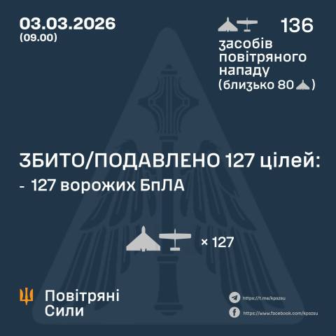 "У ніч на 03, березня (з 18:00 02 березня) противник атакував 136 ударними БпЛА типу Shahed, Гербера, Італмас та безпілотниками інших типів із напрямків: Курськ, Приморсько-Ахтарськ – рф, Гвардійське – ТОТ АР Крим, близько 80 із них – "шахеди".
