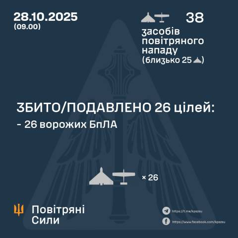 "У ніч на 28 жовтня (з 20:00 27 жовтня) противник атакував 38 ударними БпЛА типу Shahed, Гербера і безпілотниками інших типів із напрямків: Курськ, Орел, близько 25 із них – "шахеди".