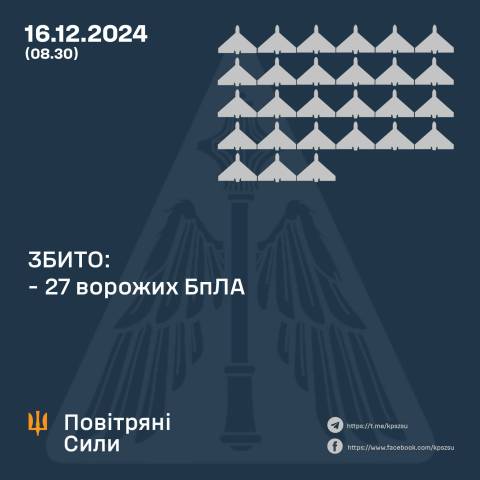 "Уночі 16 грудня 2024 року (із 01.00) противник атакував Україну 49-ма ударними БпЛА типу Shahed і безпілотниками інших типів із районів Брянськ, Орел – рф.