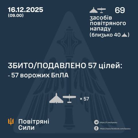 "У ніч на 16 грудня (з 18.00 15 грудня) противник атакував 69-ма ударними БпЛА типу Shahed, Гербера і безпілотниками інших типів із напрямків: Орел, Приморсько-Ахтарськ, Міллєрово – рф, Гвардійське – ТОТ АР Криму, близько 40 із них – "шахеди".