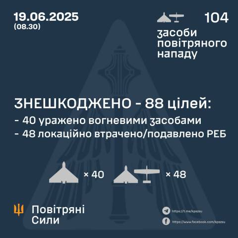 "У ніч на 19 червня (із 21.00 18 червня) противник атакував 104-ма ударними БпЛА типу Shahed і безпілотниками-імітаторами різних типів із напрямків: Міллерово, Курськ, Орел, Приморсько-Ахтарськ – рф, Чауда – ТОТ Криму.