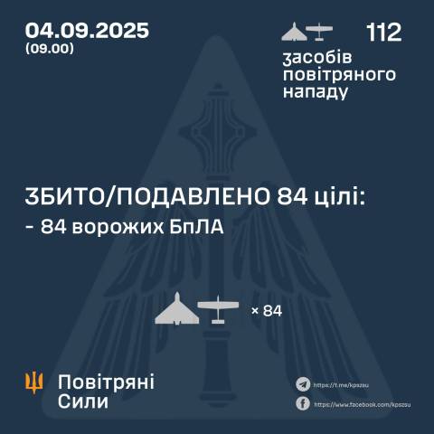 Протиповітряною обороною було знешкоджено 84 безпілотники.