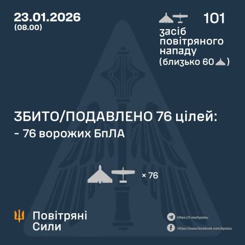 "У ніч на 23 січня (з 20:00 22 січня) противник атакував 101 ударним БпЛА типу Shahed (в т.ч. реактивними), Гербера і безпілотниками інших типів із напрямків: Курськ, Орел, Шаталово, Міллєрово, Приморсько-Ахтарськ – рф, Донецьк – ТОТ України, близько 60 із них – "шахеди".