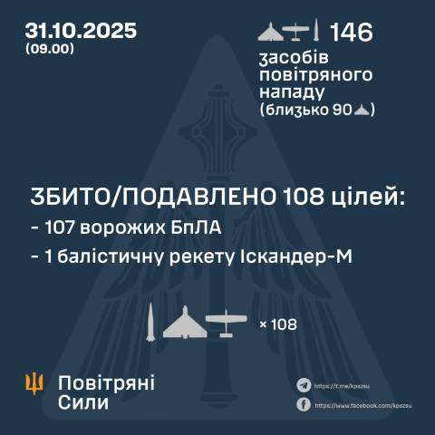 "У ніч на 31 жовтня (з 19:00 30 жовтня) противник атакував 1 балістичною ракетою Іскандер-М із Ростовської обл., 145-ма ударними БпЛА типу Shahed, Гербера і безпілотниками інших типів із напрямків: Курськ, Орел, Приморсько-Ахтарськ – рф, Чауда, Гвардійське – ТОТ АР Крим, близько 90 із них – "шахеди".