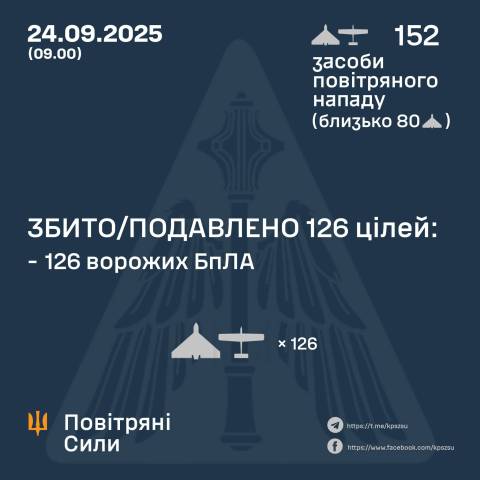 "У ніч на 24 вересня (із 18.00 23 вересня) противник атакував 152-ма ударними БпЛА типу Shahed, Гербера і безпілотниками інших типів із напрямків: Курськ, Орел, Міллєрово, Шаталово, Приморсько-Ахтарськ – рф, Гвардійське – ТОТ Криму, близько 80 із них – шахеди.