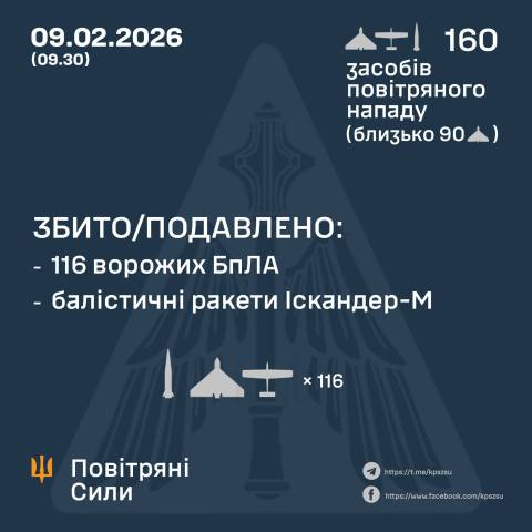 "У ніч на 09 лютого (з 17:30 08 лютого) противник атакував 11 балістичними ракетами Іскандер-М із Брянської обл., а також 149 ударними БпЛА типу Shahed, Гербера, Італмас та безпілотниками інших типів із напрямків: Курськ, Орел, Брянськ, Приморсько-Ахтарськ, Шаталово – рф, ТОТ Донецьк, Гвардійське – ТОТ АР Крим, близько 90 із них – "шахеди".