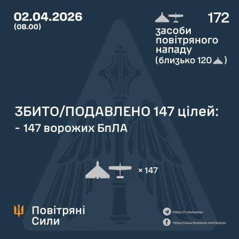 "У ніч на 02 квітня (з 18:00 01 квітня) противник атакував 172 ударними БпЛА типу Shahed, Гербера, Італмас та безпілотниками інших типів із напрямків: Брянськ, Курськ, Орел, Міллерово, Приморсько-Ахтарськ – рф, ТОТ Донецьк, Гвардійське – ТОТ АР Крим, близько 120 із них – "шахеди".