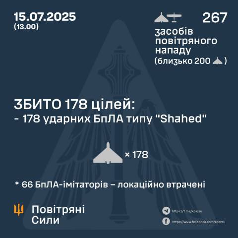 "У ніч на 15 липня (із 16.30 14 липня) противник атакував 267-ма ударними БпЛА типу Shahed і безпілотниками-імітаторами різних типів із напрямків: Орел, Брянськ, Курськ, Міллерово, Приморсько-Ахтарськ – рф, ТОТ Донецької обл. (близько 200 із них – "шахеди").