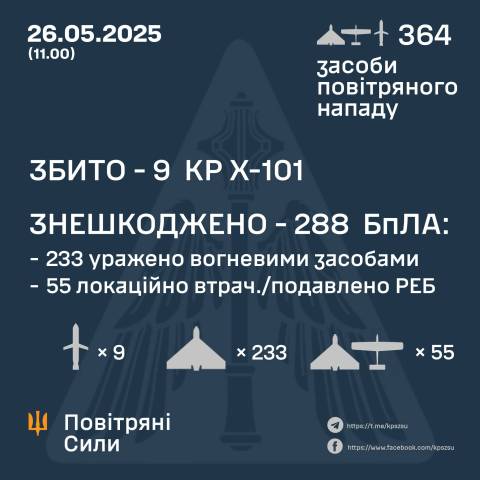 "У ніч на 26 травня (із 20.15 25 травня) противник здійснив комбінований удар по Україні із застосуванням 364-х засобів повітряного нападу противника: