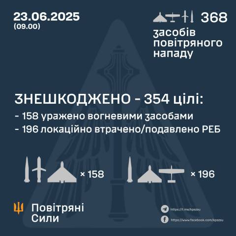 "У ніч на 23 червня (із 20.00 22 червня) противник атакував 368 засобами повітряного нападу: