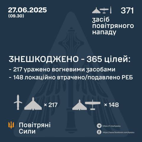 "У ніч на 27 червня (із 20.30 26 червня) противник атакував 371 засобом повітряного нападу: