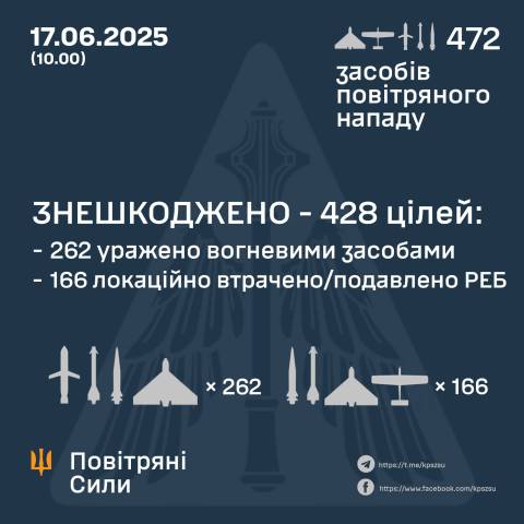 "У ніч на 17 червня (із 20.00 16 червня) противник атакував 472 засобами повітряного нападу: