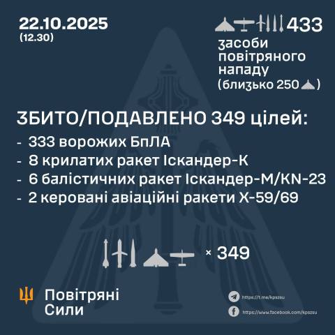 "У ніч на 22 жовтня (з 19:00 21 жовтня) противник завдав комбінованого удару по об'єктах критичної інфраструктури України із застосуванням ударних БпЛА, ракет повітряного та наземного базування. Загалом радіотехнічними військами Повітряних Сил виявлено та здійснено супровід 433 засоби повітряного нападу – 28 ракет (15 із них – "балістика") та 405 БпЛА різних типів: