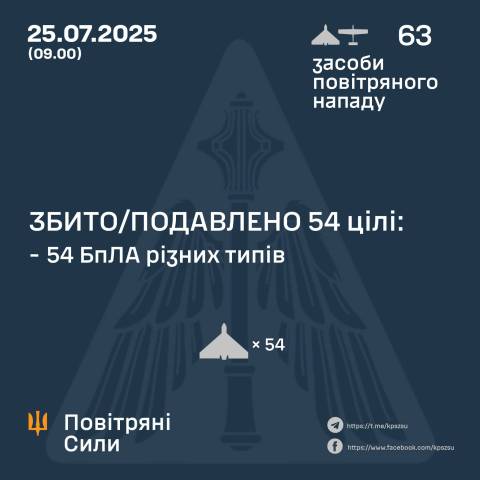 "У ніч на 25 липня (із 18.30 24 липня) противник атакував 63-ма засобами повітряного нападу: 2-ма балістичними ракетами Іскандер-М/KN-23 із Воронезької обл. – рф та 61-м ударним БпЛА типу Shahed і безпілотниками-імітаторами різних типів із напрямків: Брянськ, Курськ, Шаталово, Міллерово, Приморсько-Ахтарськ – рф.
