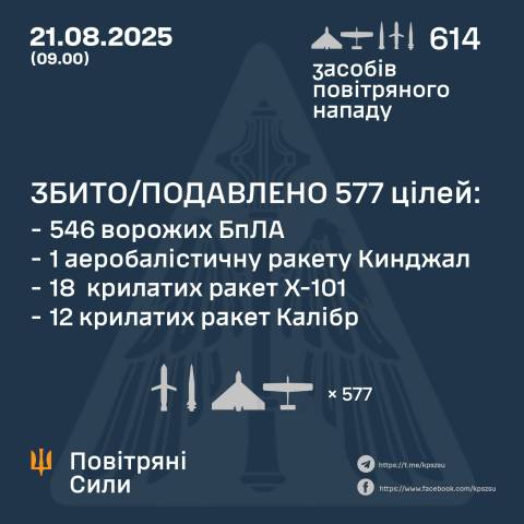 За попередніми даними, станом на 09.00, протиповітряною обороною збито/подавлено 577 повітряних цілей: 546 ворожих БпЛА типу Shahed і дронів-імітаторів різних типів; 1 аеробалістичну ракету Х-47М2 "Кинджал"; 18 крилатих ракет Х-101; 12 крилатих ракет Калібр.