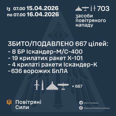 "З 07.00 15 квітня по 07.00 16 квітня противник здійснив дві хвилі комбінованих атак по території України із застосуванням ракет наземного, повітряного базування та ударних безпілотників. Всього виявлено та здійснено супровід 703 повітряних цілей: