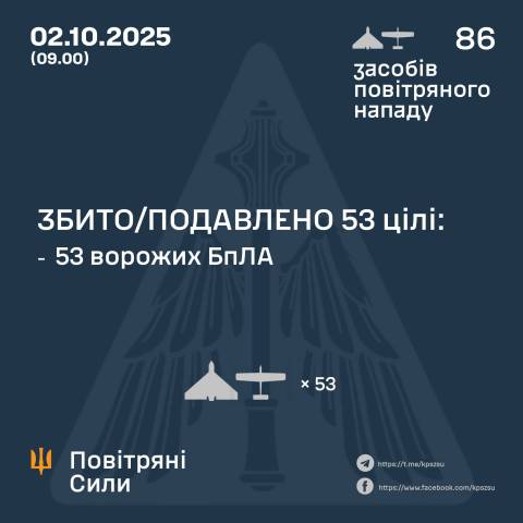Протиповітряною обороною було знешкоджено 53 безпілотники.
