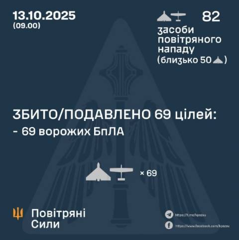 "У ніч на 13 жовтня (з 20:00 12 жовтня) противник атакував 82 ударними БпЛА типу Shahed, Гербера і безпілотниками інших типів із напрямків: Орел, Курськ, Приморсько-Ахтарськ – рф, близько 50 із них – ударні БпЛА.