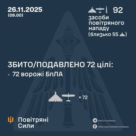 "У ніч на 26 листопада (з 19:00 25 листопада) противник атакував двома балістичними ракетами Іскандер-М (пуски із Ростовської області – рф), та 90-та ударними БпЛА типу Shahed, Гербера і безпілотниками інших типів із напрямків: Курськ, Міллєрово, Приморсько-Ахтарськ, – рф, Гвардійське – ТОТ АР Крим, близько 55 із них – "шахеди".
